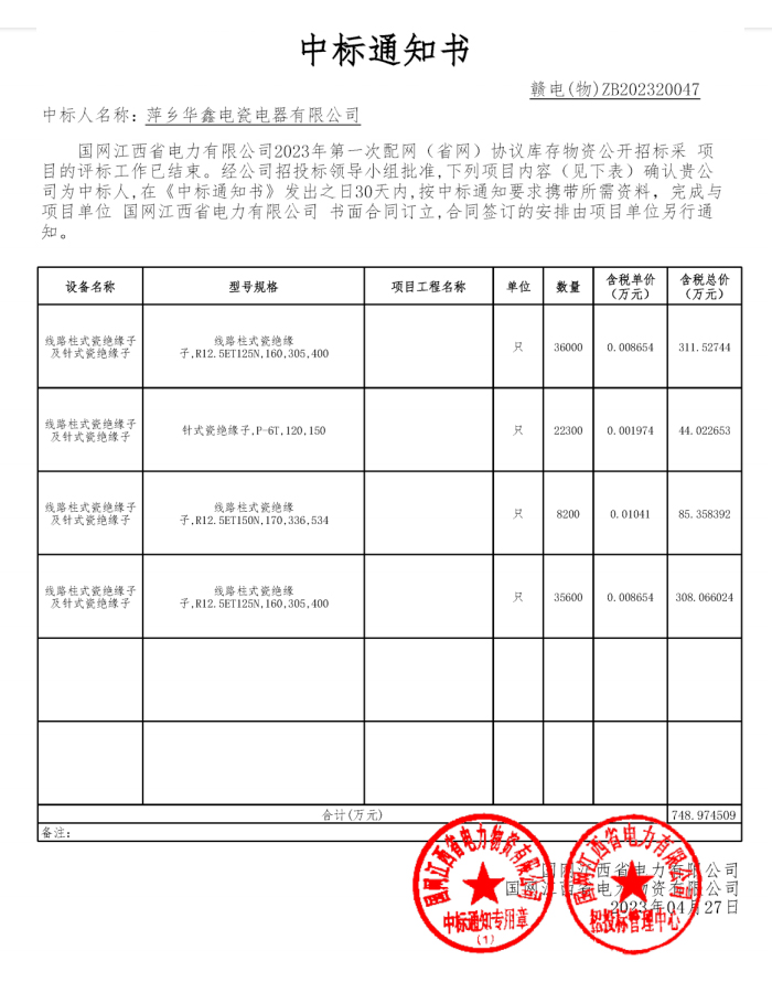 中標(biāo)通知書—贛電(物)ZB202320047